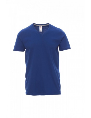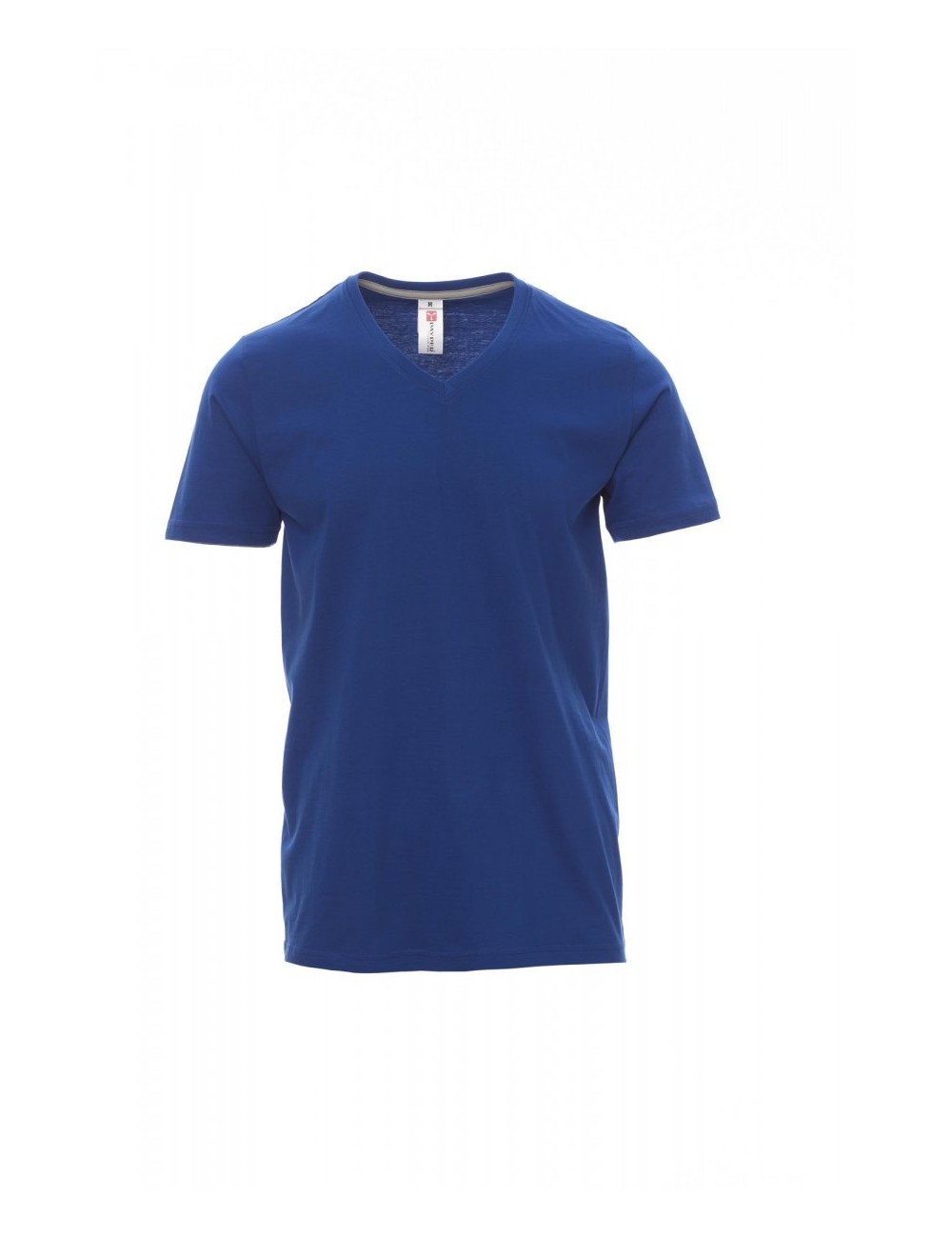 T-shirt da uomo collo a V manica corta, colletto in costina misto spandex da 1,5 cm con cucitura ribatutta sul davanti, nastro di rinforzo da spalla a spalla in colore a contrasto visibile nel colletto, cuciture stretch, struttura tubolare. Composizione 100% COTONE Aspetto JERSEY Peso 155 GR/MQ